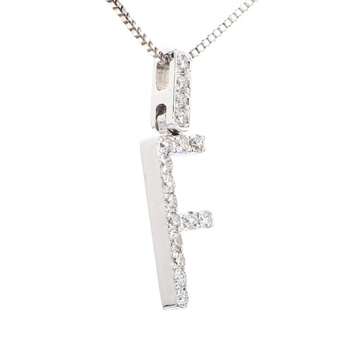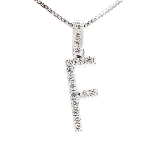 This elegant initial "F" pendant is meticulously crafted from 14 karat white gold, exuding sophistication and charm. With a weight ranging between 1.5 to 2 grams, it offers a delicate yet substantial presence. The initial is adorned with sparkling diamonds totaling between 0.5 to 0.7 carats, enhancing its allure with their radiant brilliance. These diamonds boast a pristine DF color grade, ensuring exceptional whiteness and brilliance that catch the eye. With SI clarity, they exhibit slight inclusions visible under magnification, maintaining transparency and adding to their unique character. Whether worn as a personalized statement piece or as a meaningful gift, this initial "F" pendant is sure to be treasured for its beauty and elegance.