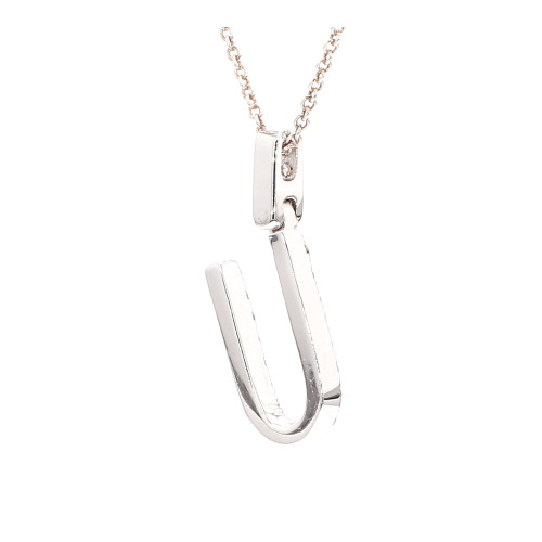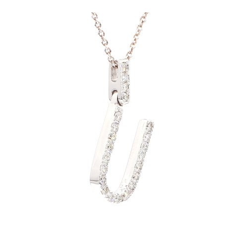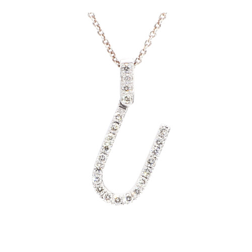 Introducing the Initial "U" pendant, a personalized piece of elegance and charm. Crafted from lustrous 14-karat white gold, this pendant boasts a sleek and modern design. The centerpiece of the pendant features exquisite diamonds totaling between 0.5 to 0.7 carats, meticulously set to form the shape of the letter "U". These diamonds showcase a remarkable combination of color and clarity, with a rating of DF and SI respectively, ensuring a captivating sparkle. With a weight of 1.5 to 2 grams, this pendant is lightweight and comfortable to wear. Add a touch of individuality and sophistication to your ensemble with this stunning Initial "U" pendant.