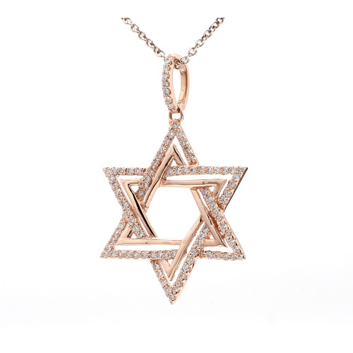 This elegant piece of jewelry features a Star of David pendant crafted from rose gold. The pendant has a weight of 2.6 grams and is made of 14 karat gold, ensuring both durability and a rich, warm hue. Adorning the pendant are exquisite diamonds totaling 0.2 carats. The diamonds exhibit a quality of SI, indicating slight inclusions that are not easily visible to the naked eye. Furthermore, the diamonds boast a color grade of FG, ranging from colorless to near colorless, adding a touch of brilliance to this stunning and meaningful accessory. The combination of rose gold and diamonds makes this Star of David pendant a beautiful and timeless symbol.