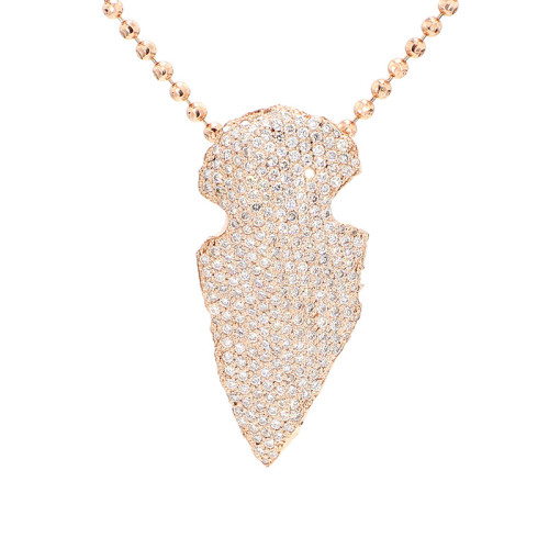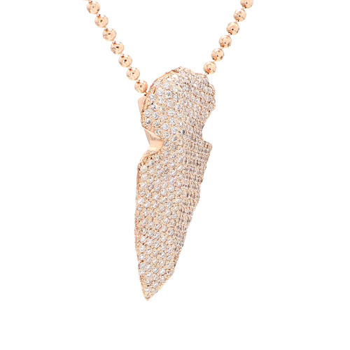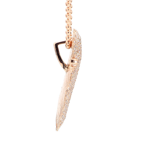 This exquisite necklace is meticulously crafted from 14 karat yellow gold and boasts a delicate 22-inch rose gold chain. With a weight of 19 grams, it exudes both elegance and substance. The necklace is adorned with a dazzling array of micro pave diamonds, totaling an impressive 3 carats. These diamonds exhibit a refined color spectrum ranging from G to H, ensuring a brilliant sparkle, while their clarity falls within the VS2-SI1 range, signifying exceptional purity and brilliance.