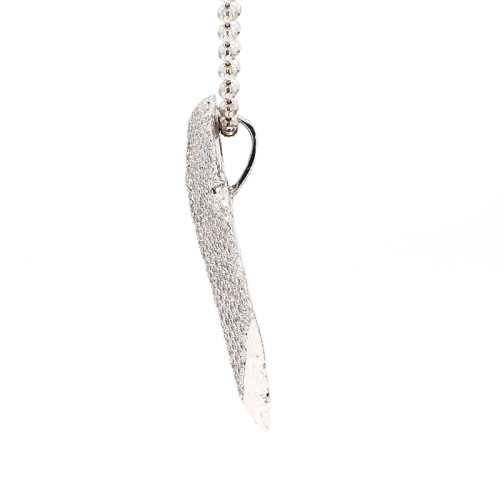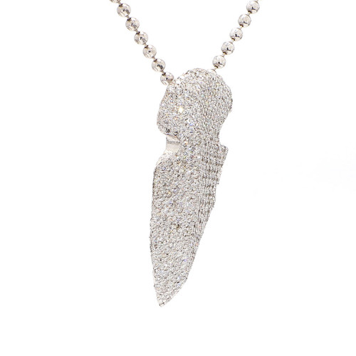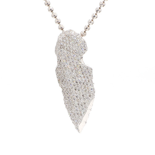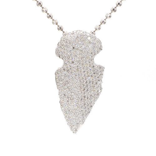 This "Gold Alaska" tip features a sophisticated design crafted from 14 karat white gold. The tip is complemented by a 22-inch white gold chain, providing an elegant touch to the piece. Weighing 19 grams, it offers both substance and style. The tip is adorned with a dazzling array of micro pave diamonds totaling 3.20 carats. These diamonds boast a G-H color grade, indicating near-colorless to faint color, and VS2-SI1 clarity, signifying exceptional purity and brilliance. This exquisite tip combines luxurious materials with exquisite craftsmanship, making it a stunning addition to any collection.