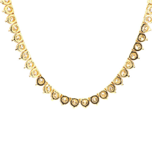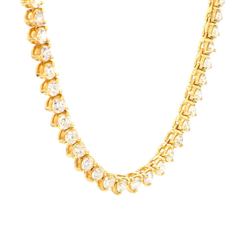 Introducing our exquisite Three-Prong Tennis Chain, crafted in 14-karat yellow gold and boasting a substantial weight of 46 grams. This luxurious chain features a stunning array of diamonds totaling 22 carats, elegantly set in a classic tennis design. The diamonds exhibit SI clarity, ensuring brilliance and sparkle, while their color ranges from K to M, imparting a warm and unique hue to the piece. The Three-Prong Tennis Chain is a statement of opulence and sophistication, perfect for adding a touch of glamour to any ensemble. Whether worn alone or layered with other necklaces, this chain is sure to dazzle and impress.
