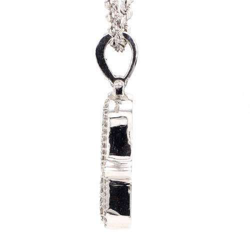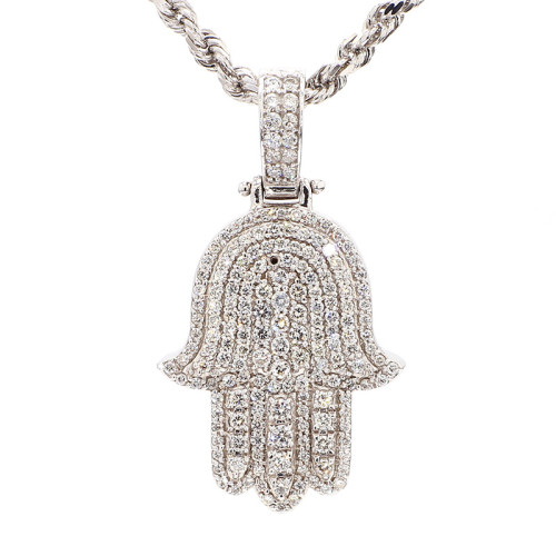 This white gold "Hamsa" pendant exudes elegance and spiritual significance. Crafted from 14 karat white gold and weighing 14.8 grams, it boasts substantial weight and durability. Adorned with a total of 3 carats of diamonds, the pendant sparkles with brilliance and sophistication. These diamonds exhibit SI1 clarity, meaning they have minor inclusions visible under magnification, but are still of high quality. Additionally, the diamonds feature a color grade of G-H, showcasing near-colorless to faintly colored stones. This pendant serves not only as a stylish accessory but also as a symbol of protection and positivity, making it a meaningful addition to any jewelry collection.