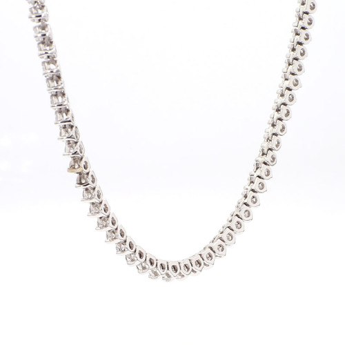 This stunning white gold tennis chain exudes sophistication and luxury. Crafted from 14 karat white gold, it weighs a substantial 28 grams, ensuring both durability and elegance. With a length of 25 inches, it drapes gracefully around the neck, making a bold statement. Adorning the chain are a total of 8.5 carats of dazzling diamonds, each exhibiting VS clarity, indicating exceptional transparency with minor inclusions, and FG color, showcasing near-colorless to faintly colored stones. Whether worn alone or layered with other pieces, this white gold tennis chain adds a touch of glamour and refinement to any ensemble.