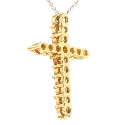 This striking piece of jewelry features a cross pendant crafted from radiant yellow gold. The pendant has a substantial weight of 4.30 grams and is made of 14 karat gold, ensuring both durability and a warm, timeless glow. The centerpiece of this cross is a dazzling 1.28-carat diamond, showcasing a mesmerizing brilliance. The diamond is graded as SI3, indicating slight inclusions that may be visible under magnification but do not compromise the overall beauty of the stone. The diamond's color is graded as GH, falling within the near-colorless range. The combination of the rich yellow gold and the impressive diamond makes this cross pendant a bold and spiritually significant accessory, blending craftsmanship with elegance.